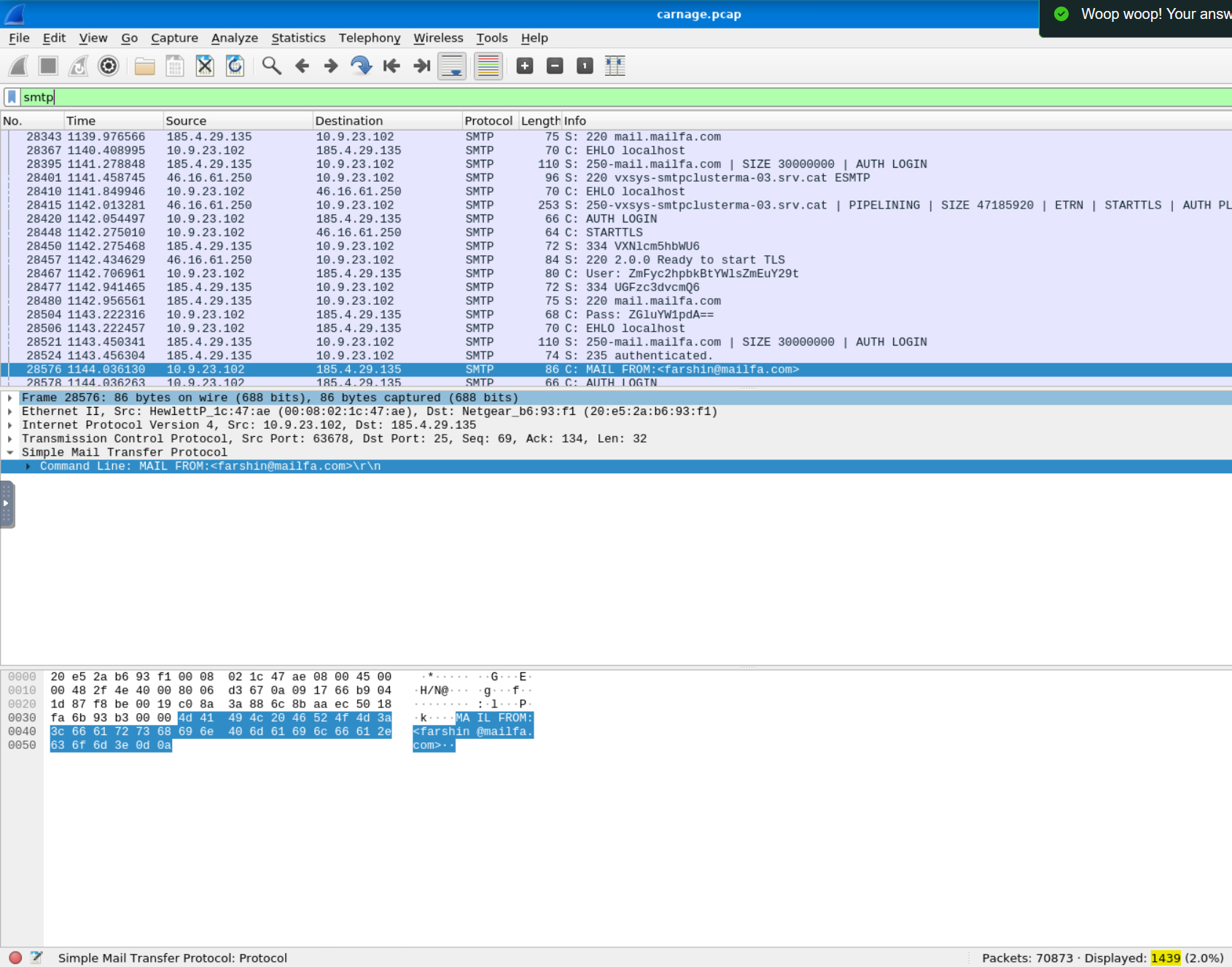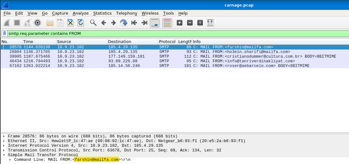 We can find the first “MAIL FROM” by searching SMTP traffic: smtp.req.parameter contains FROM