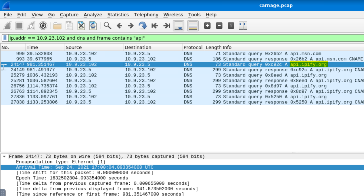 We can craft a filter that involves the victim’s IP address, DNS, and a search for “api” in the frame. The following does the trick: ip.addr == 10.9.23.102 and dns and frame contains "api".