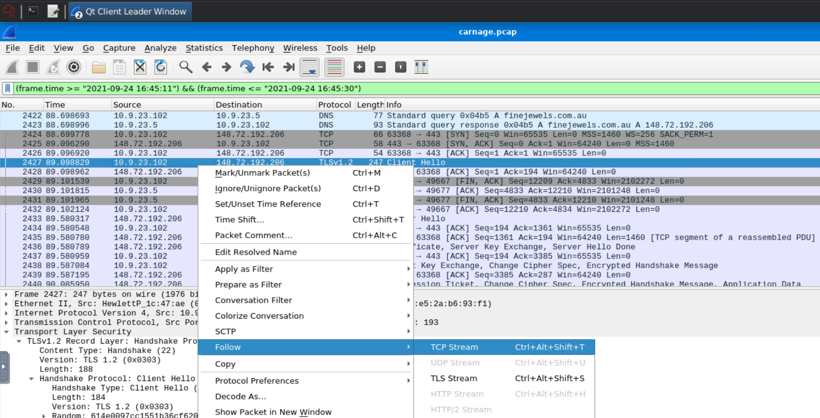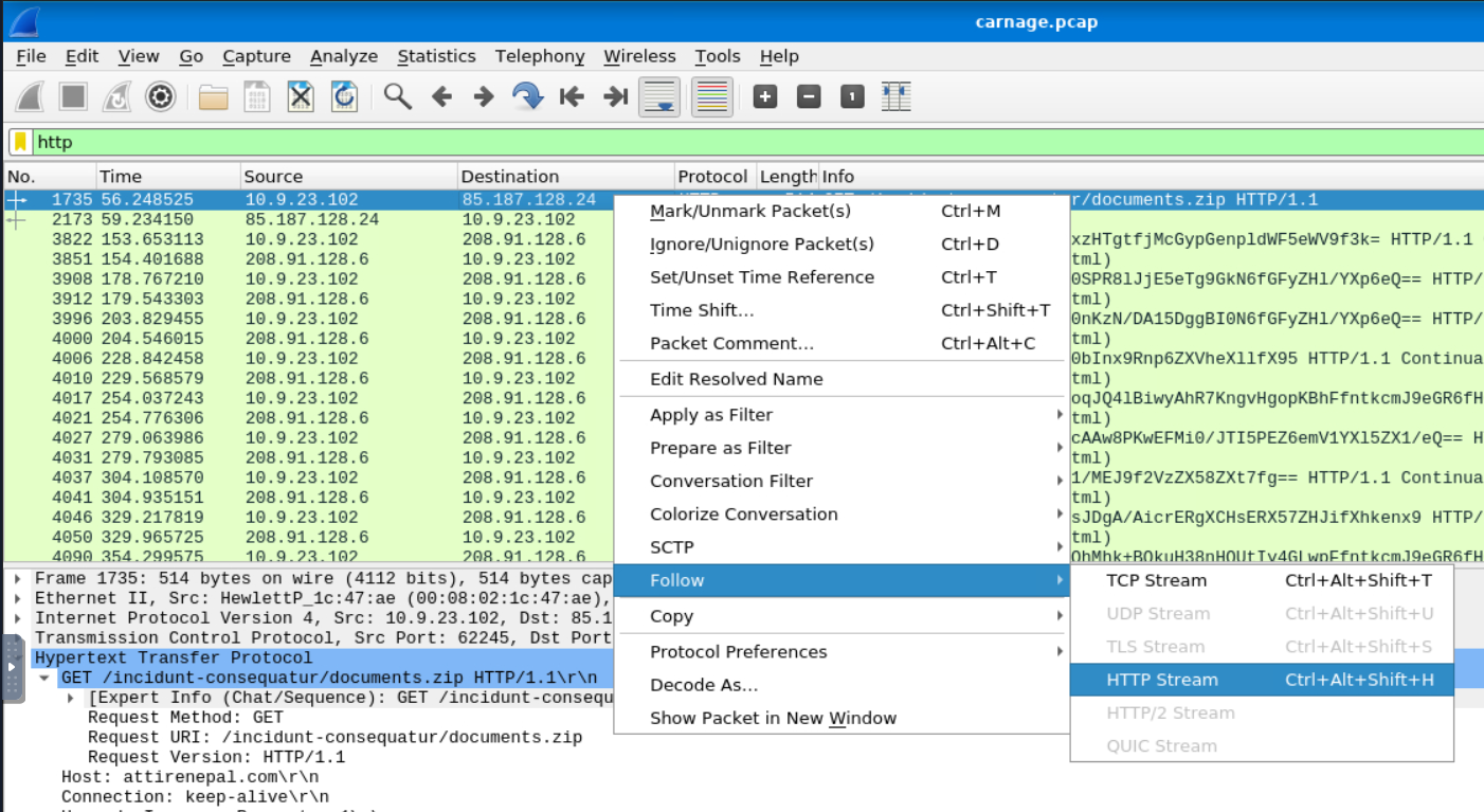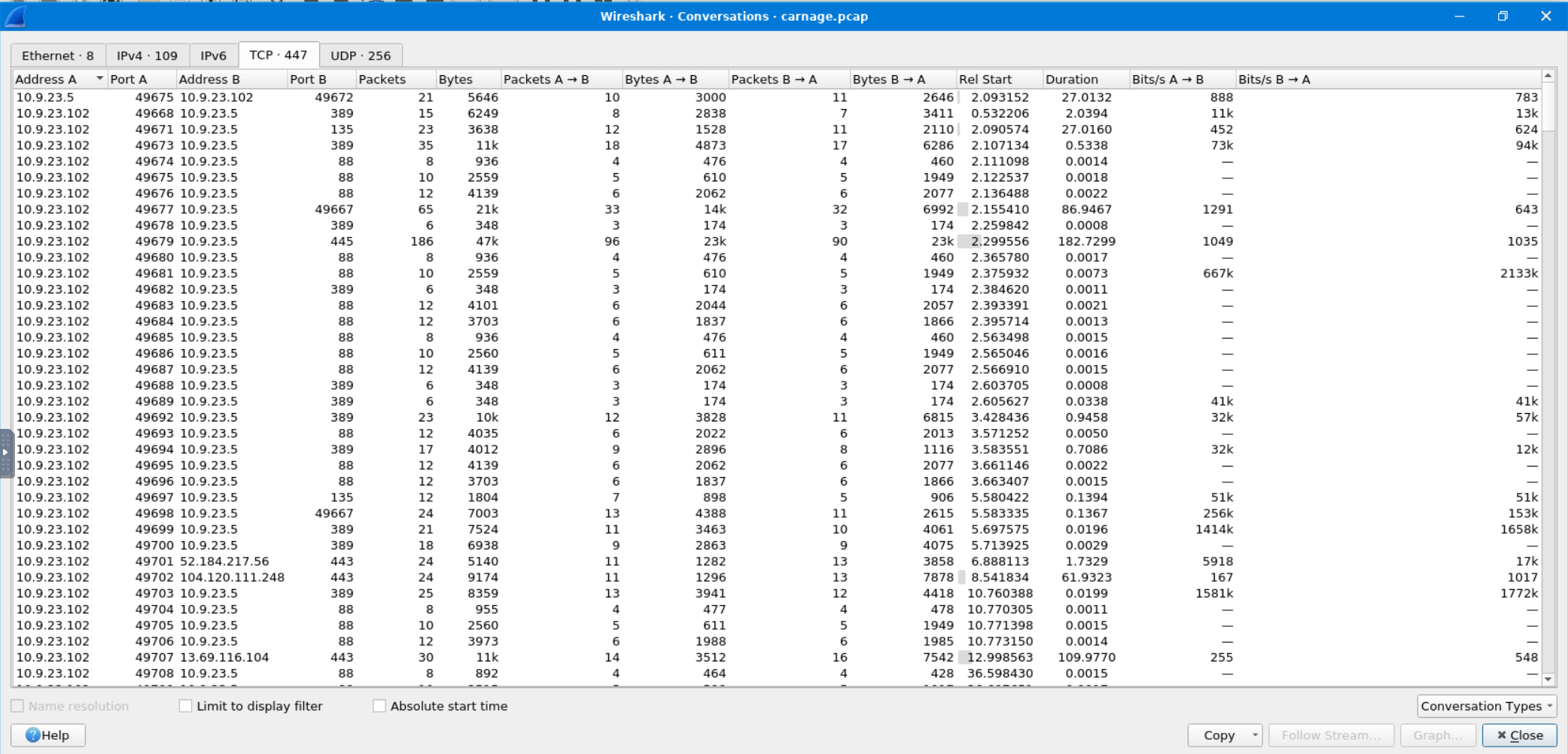 We see 10.9.23.102 communicating with a lot of other addresses, but we don’t know which are the C2 servers yet, so we’ll need to check each of them out. Anything with an address like 10.9.23.XXX can be presumed to be part of the same subnet and thus not our suspect C2s.