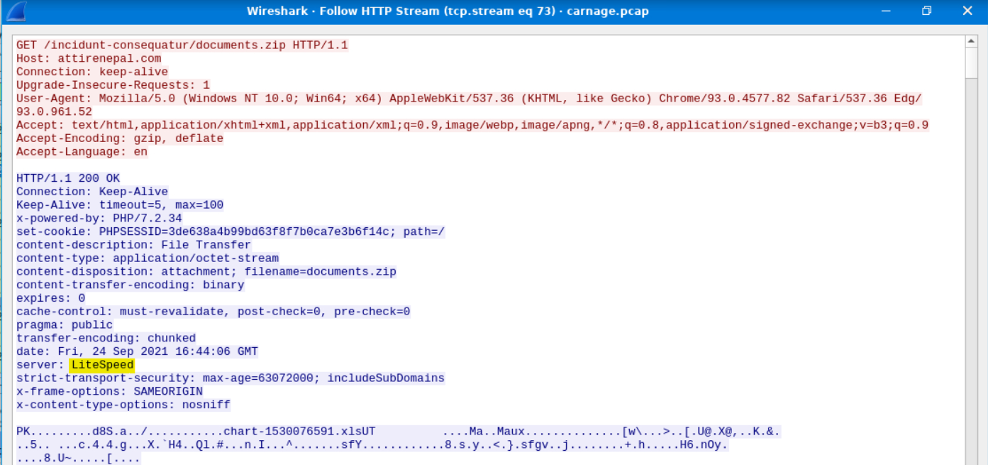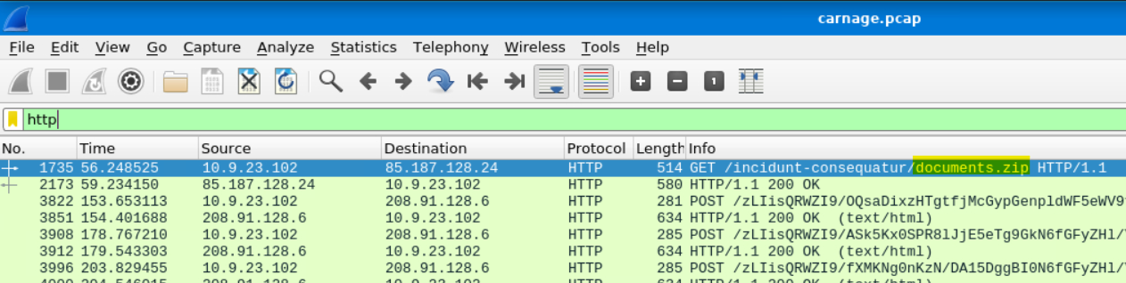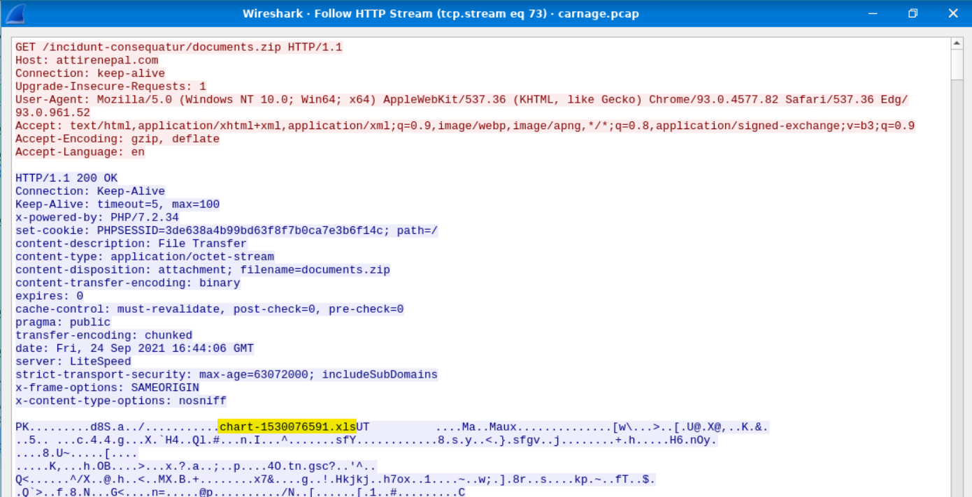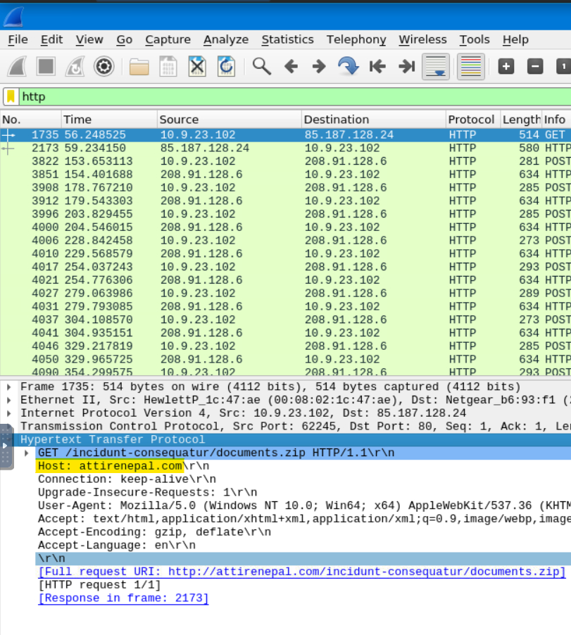 Eric Fischer from the Purchasing Department at Bartell Ltd has received an email from a known contact with a Word document attachment. Upon opening the document, he accidentally clicked on “Enable Content.” The SOC Department immediately received an alert from the endpoint agent that Eric’s workstation was making suspicious connections outbound. The pcap was retrieved from the network sensor and handed to you for analysis.