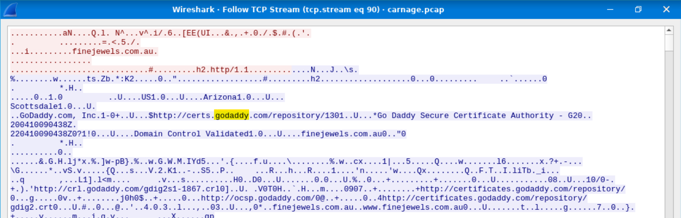 I followed the TCP stream and found reference to the certificate authority in the results: