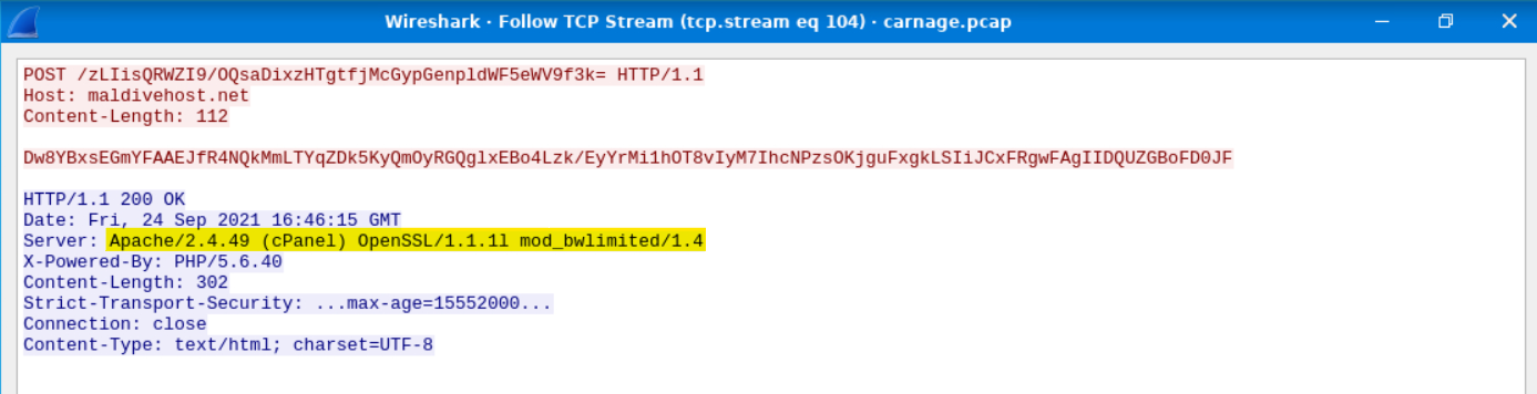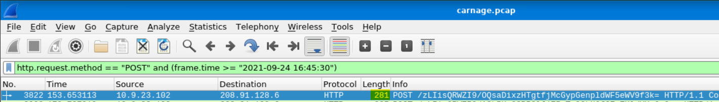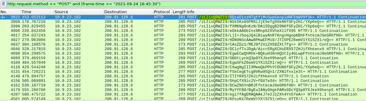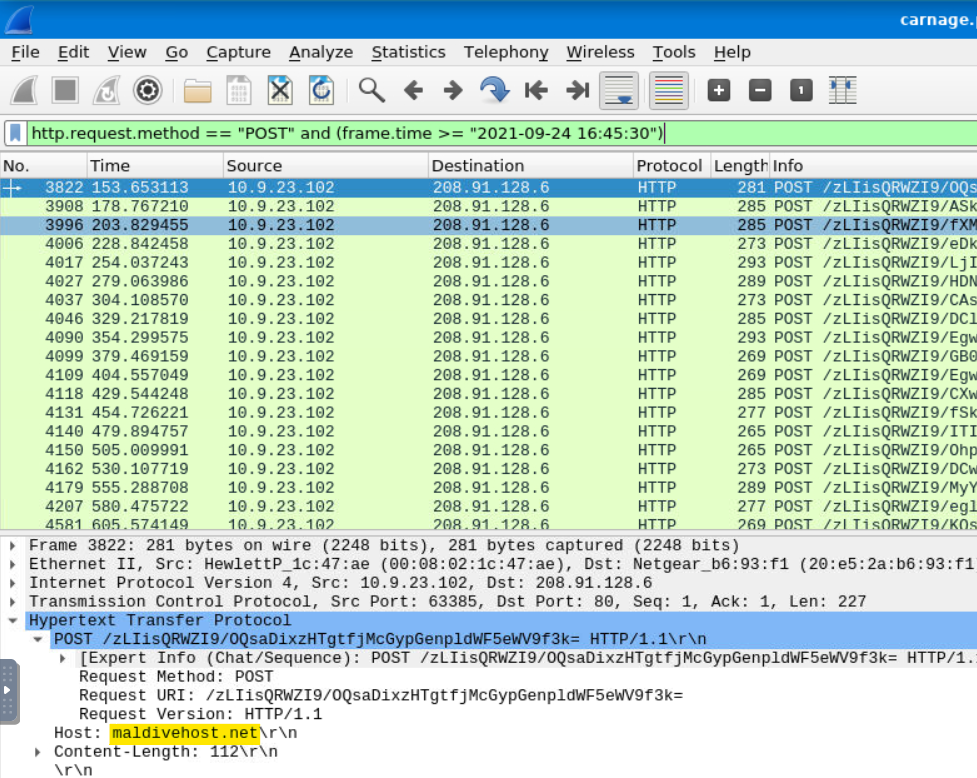 Looking for HTTP traffic after the time period in which the infection happened, we see many POST packets directed to one domain.