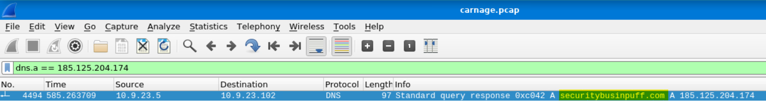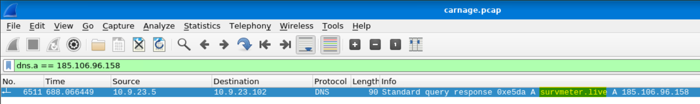 We can find this in Wireshark by searching for the DNS A record for 185.106.96.158. The filter is as follows: dns.a == 185.106.96.158.