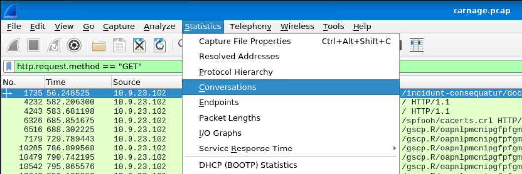 We’re looking for information on IP addresses that the affected machine is making regular contact with. We can begin our search by looking for GET requests by using the following filter: http.request.method == "GET".